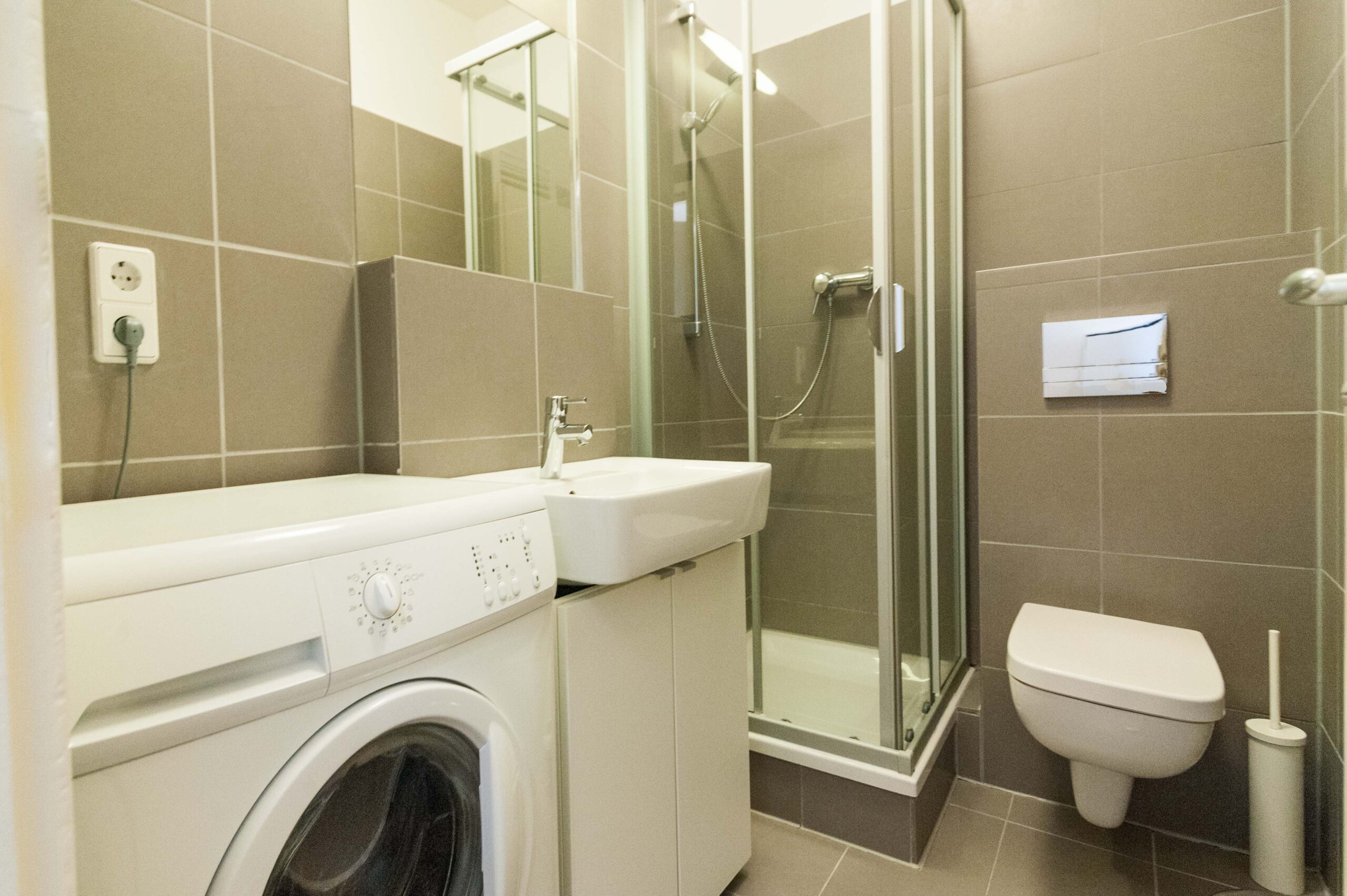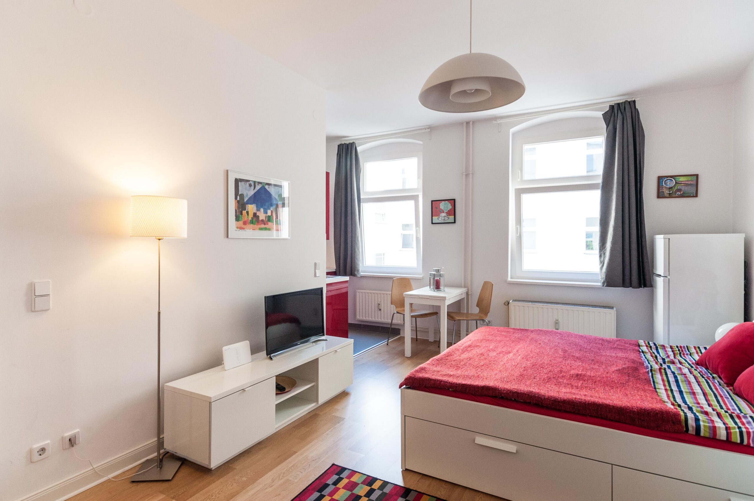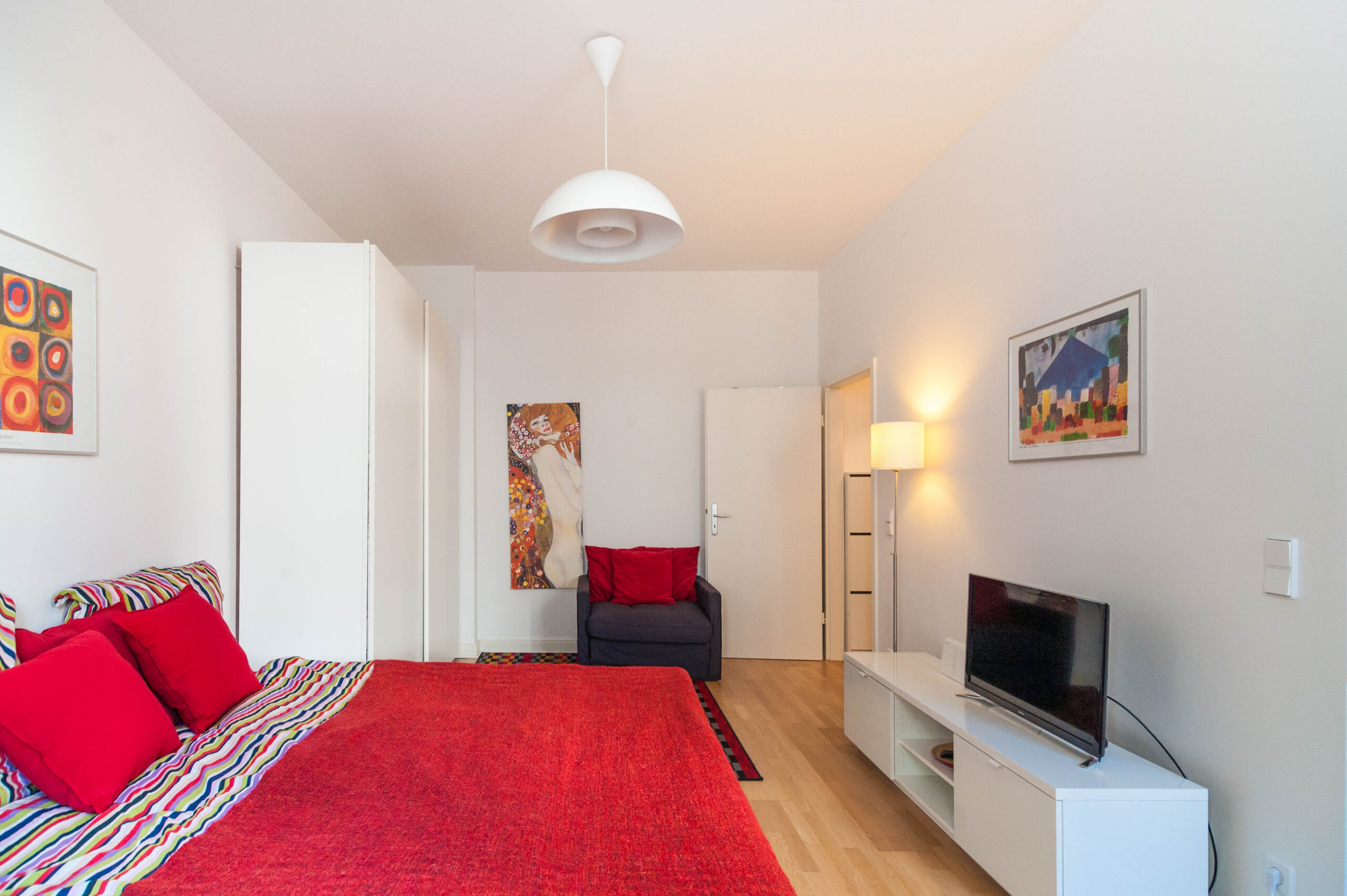 The beautiful studio apartment is located on the 3rd floor in the quiet rear building. It has a double bed, a big wardrobe for clothing, a dining table with chairs, a comfy amrchair and a TV bench with TV. The American-style kitchen has fitted cupboards and kitchen equipment. The fully tiled bathroom has a shower and there is also a washing machine. In the apartment there are some kitchen utensils, bedding and towels, but depending on your needs you might need to bring some in addition.